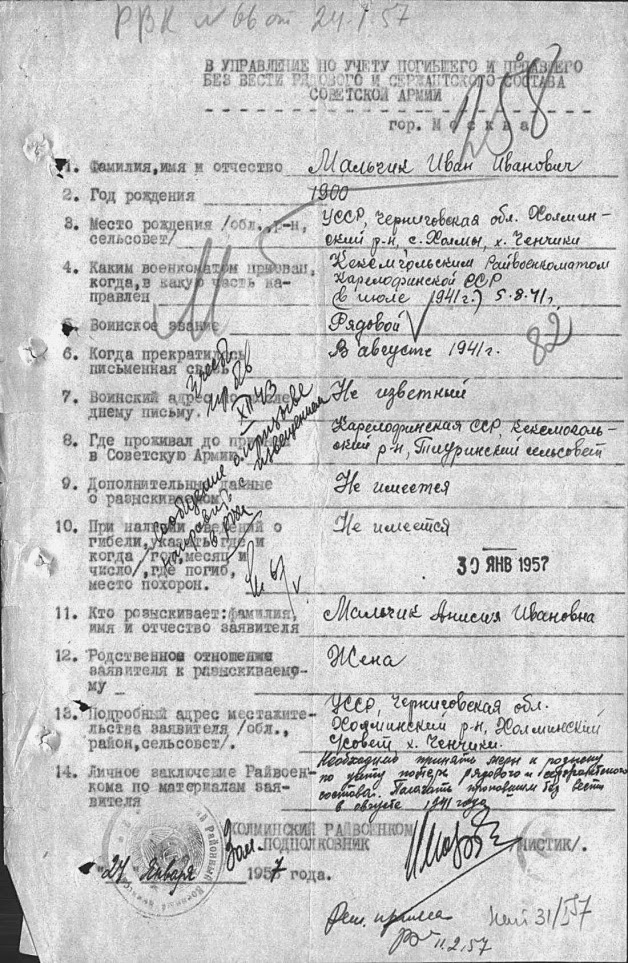 Івана Івановича, забрали на фронт влітку 1941 року. Він загинув при обороні